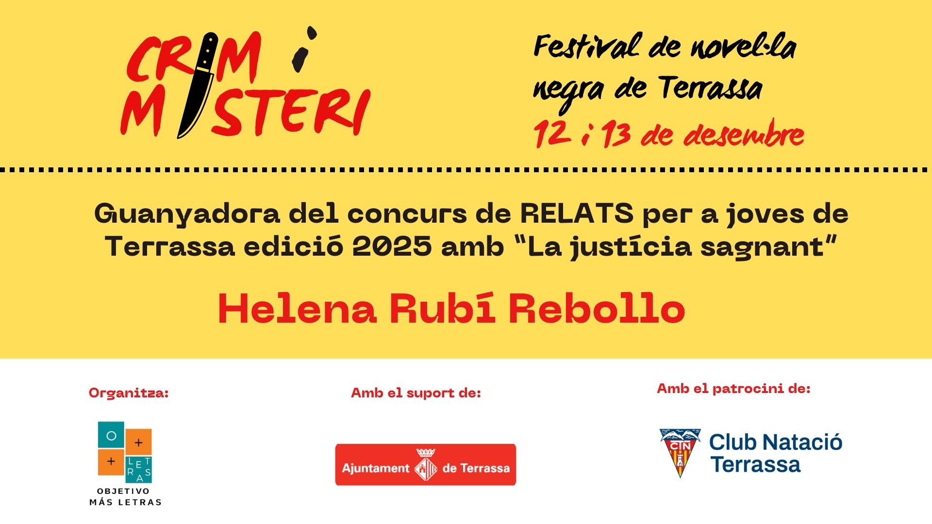 La jove terrassenca Helena Rubí ha guanyat el premi a millor relat dins del Festival Crim i Misteri Terrassa 2ona. edició. Va ser entregat pel Club Natació Terrassa, que promocionava el premi, de mà del Sr. Manel Pérez, de la seva Junta Directiva.